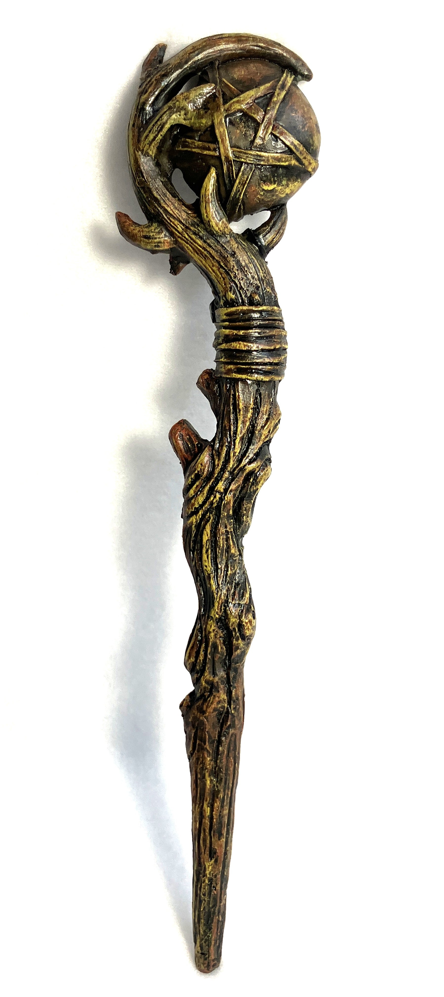 #3 Pentagram Magic Wand. This pentacle wand has a wood-look shaft appx. 9.75" long with very detailed branch detail. Wands are used in many magickal traditions to direct and focus energy to project it to cast a circle for sacred space or release energy raised to the universe to work your will. The wand is Hand Painted polished resin.